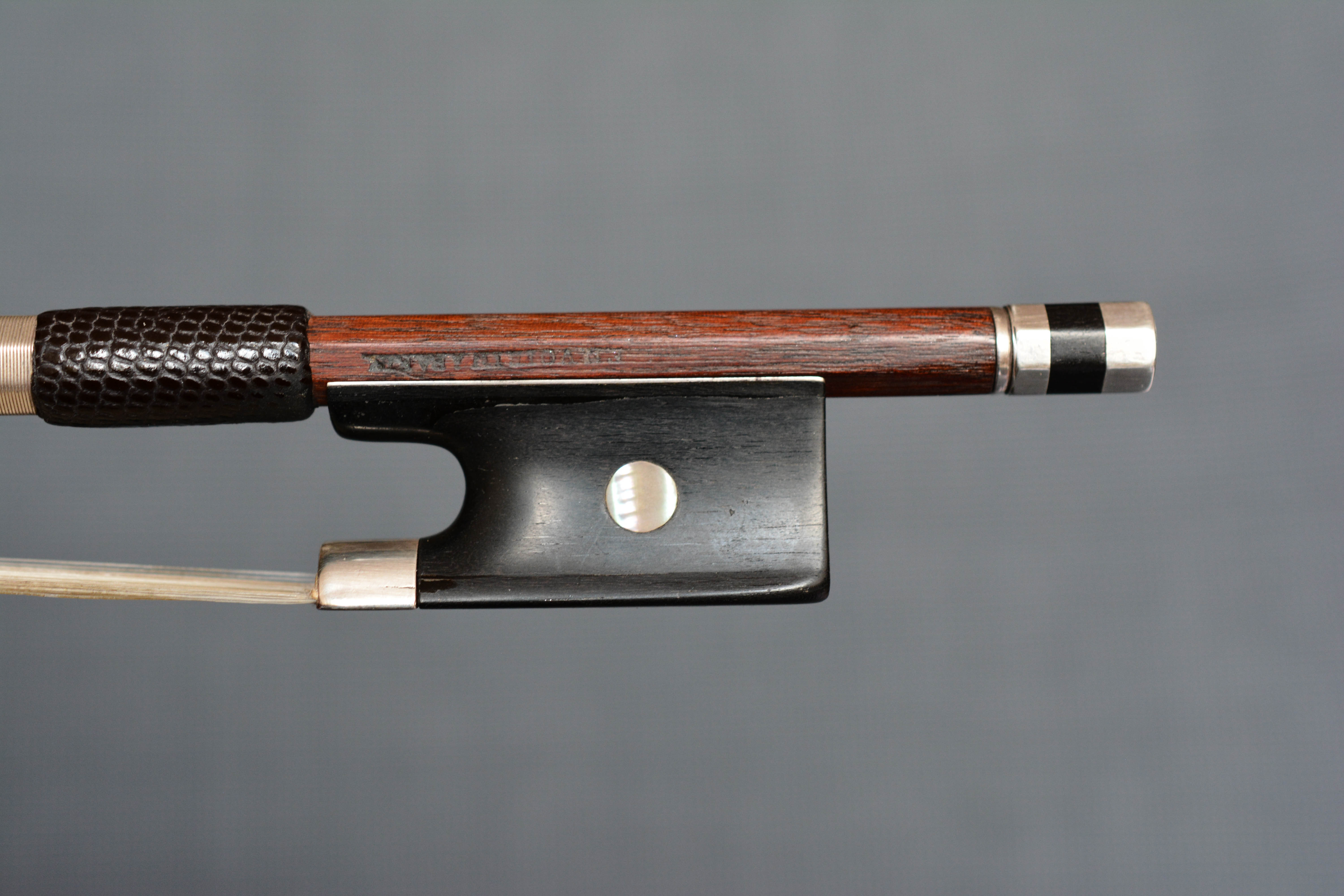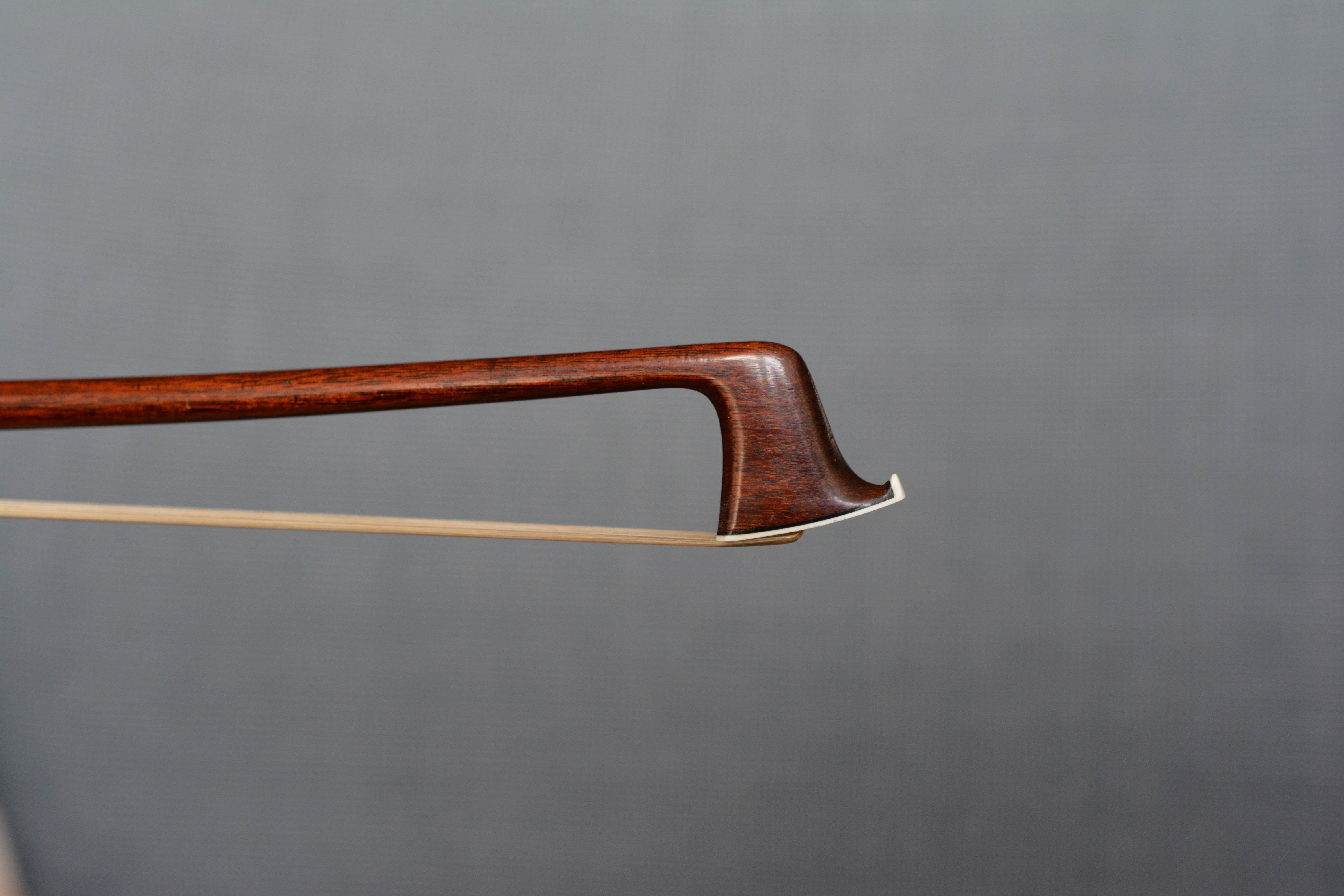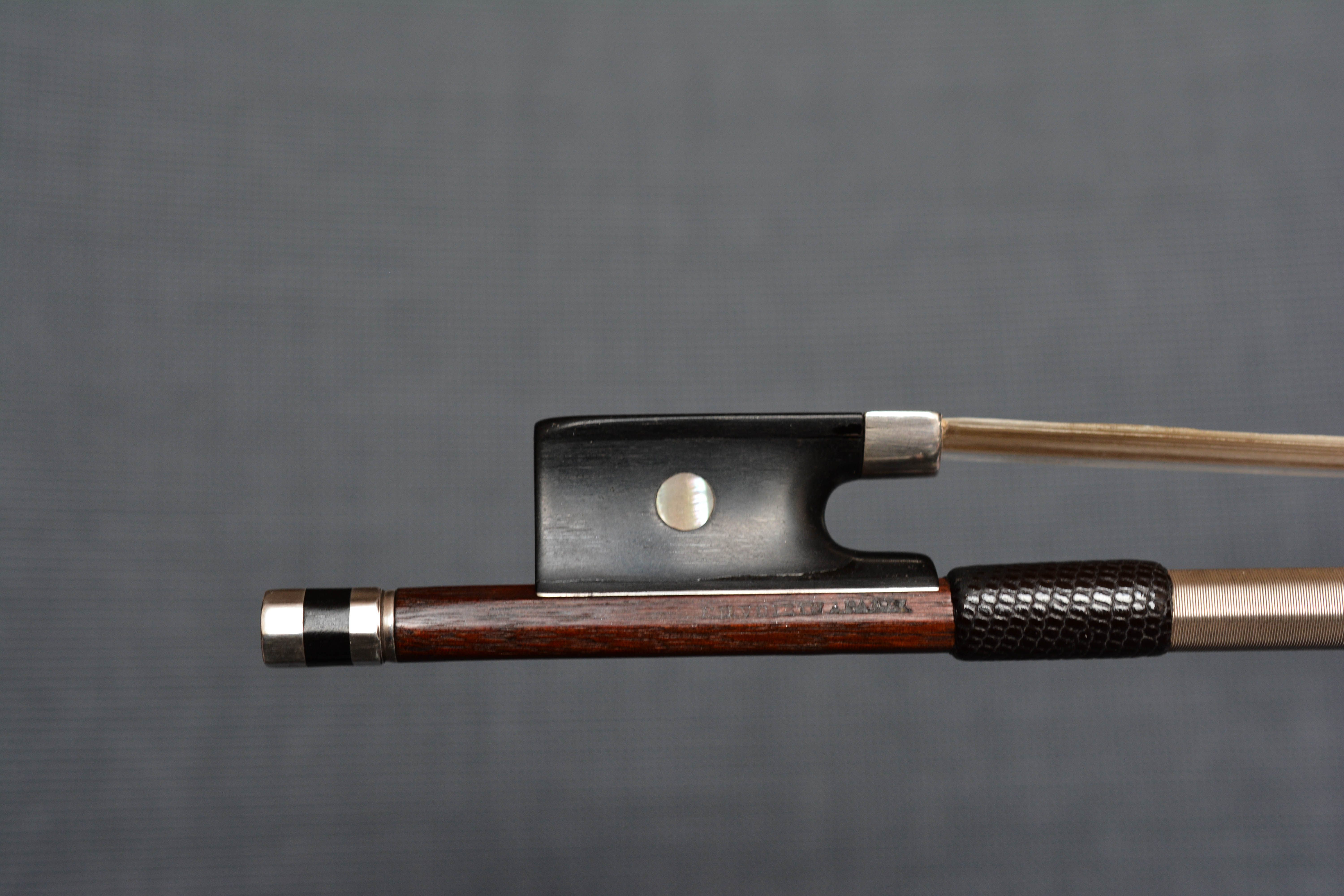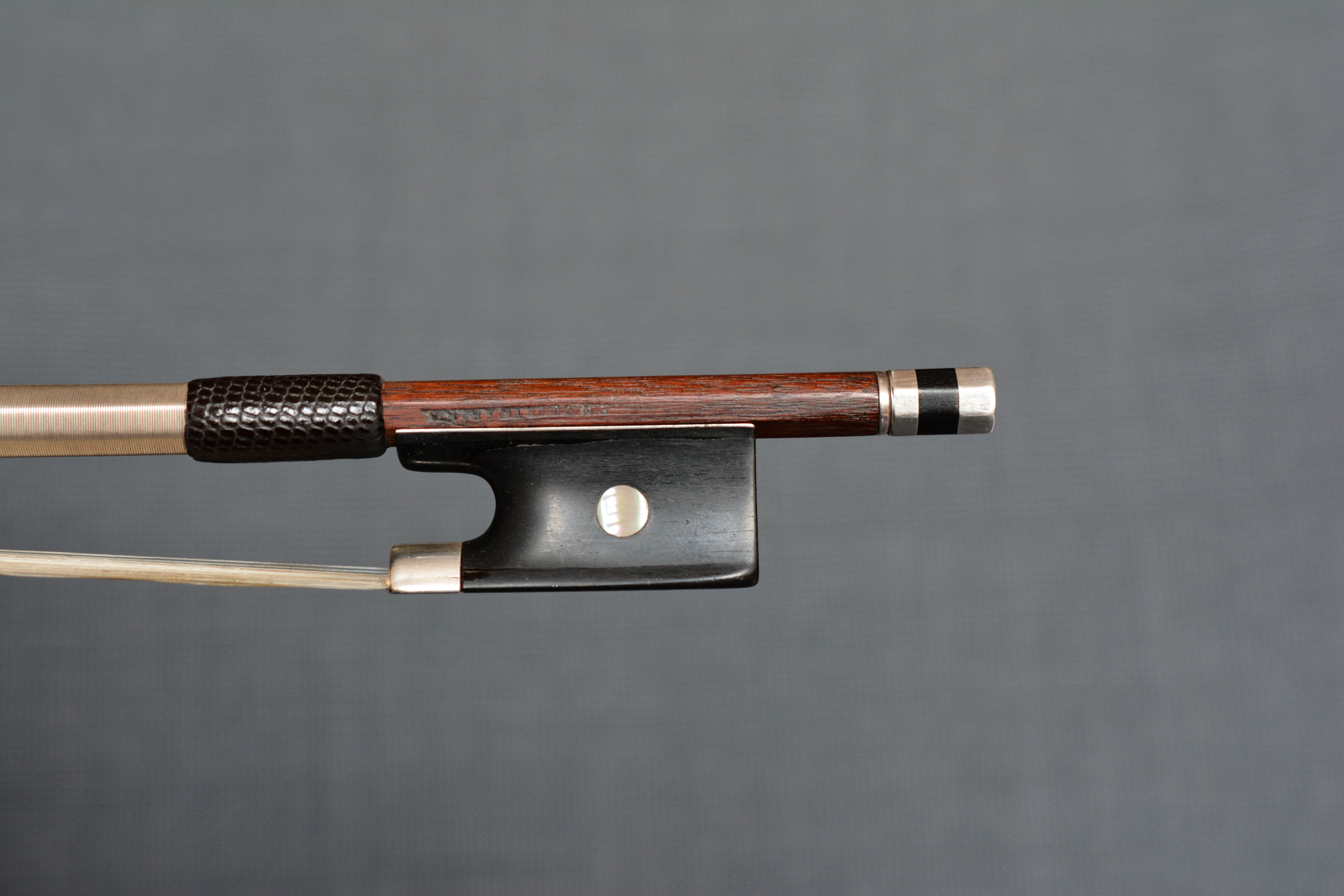 Voirin, François Nicolas (1833 - 1885) in Paris, Voirin war ein Cousin von JB Vuillaume. F.N. Voirin war der Bruder von Joseph Voirin. Er wurde als "Modern Tourte" bekannt. Zuerst Geigen gemacht. Die Lehre in Mirecourt arbeitete zunächst in der Werkstatt von Vuillaume (1855 bis 1870). Tatsächlich waren seine frühen Bögen mit dem Namen Vuillaume versehen. Er produzierte einen radikal anderen Bogen als Tourte; Schlankerer Kopf; Der Sturz bewegte sich näher an den Kopf heran, ergab einen stärkeren Stock und verringerte die Dicke des Schafts, insbesondere an der Ferse. Ein sehr, vielleicht zu leichter (so niedrig wie 52 gr.), Aber starker Stock. Um 1870 zogen die meisten französischen Hersteller, inspiriert von Voirin, von der Tourte-Peccatte-Schule ab. Diese Veränderungen betrafen nicht nur den Kopf, der jetzt leichter, runder und weiblicher war, sondern die Sturzkurve konzentriert sich jetzt auf den dritten Bogen direkt hinter dem Kopf. (Vor Voirin war es im mittleren Drittel des Bogens.) Auch bei Voirin waren die Höhen von Kopf und Frosch niedriger als zuvor.